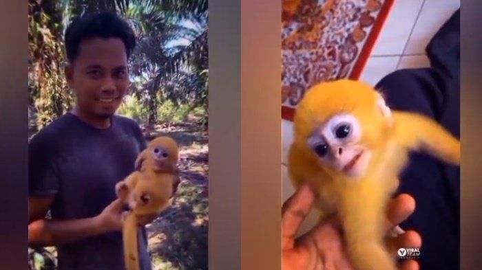 Dalam video menunjukkan seorang pria tengah mengendong seekor monyet kecil berwarna kuning dengan memiliki ekor yang panjang.