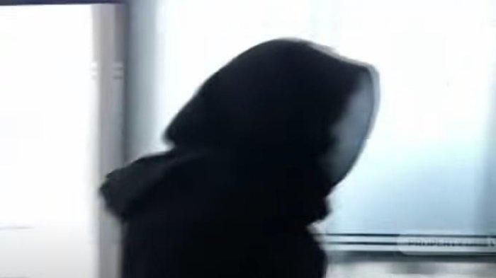 Dia tampil berpakaian serba hitam. Kerudung hitam dan juga masker hitam.