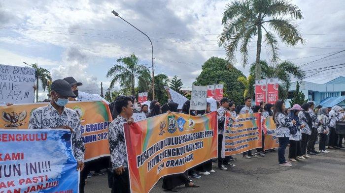 TRIBUNBENGKULU.COM, BENGKULU - Ratusan guru honorer lulus passing grade tes Pegawai Pemerintah Dengan Perjanjian Kerja (PPPK) 2021 menggelar demo di kantor Gubernur Bengkulu, Senin (18/10/2022).