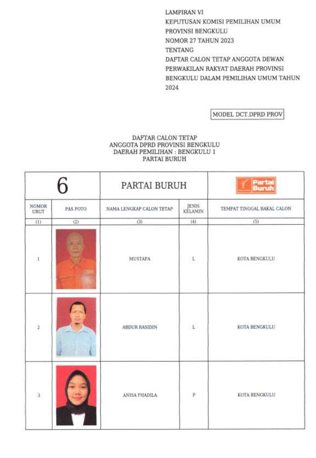 Berikut daftar caleg Partai Buruh untuk DPRD Provinsi Bengkulu Pemilu 2024