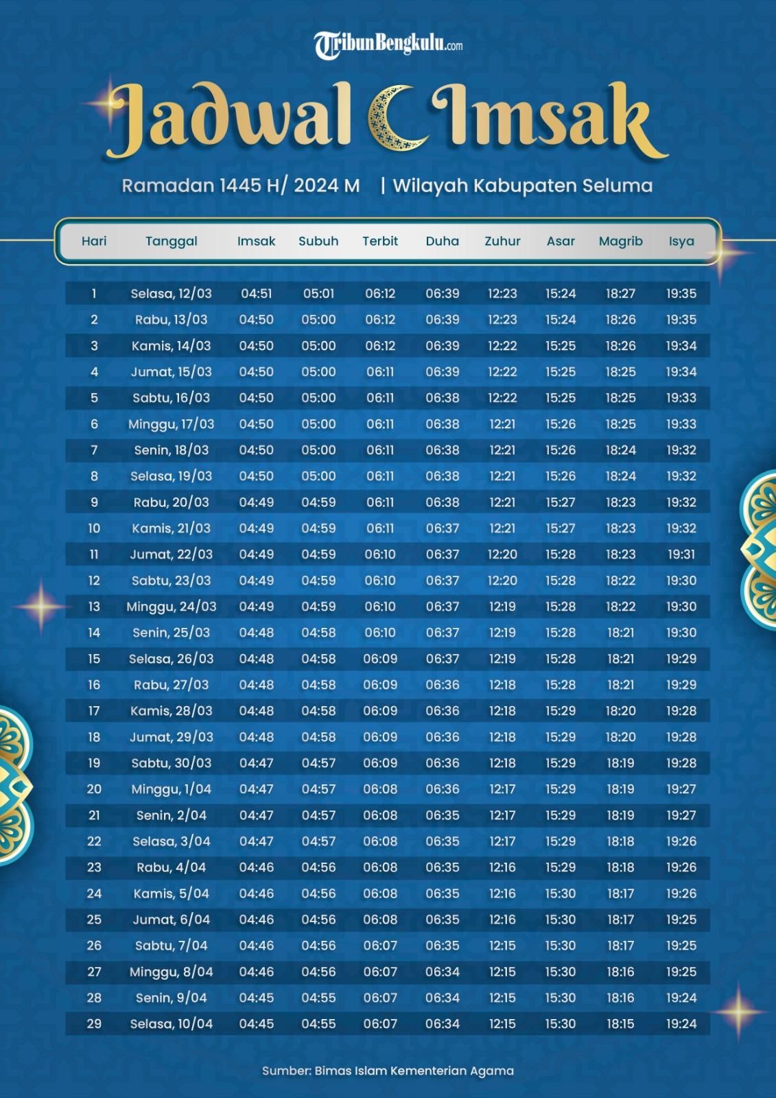 Berikut jadwal imsak, berbuka puasa dan jadwal sholat wilayah Kabupaten Seluma dan sekitarnya Ramadhan 1445 H/2024 M full.