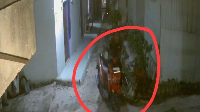 Terlibat dari rekaman CCTV pelaku keluar dari dalam kosan korban dan mendorong motor milik korban hingga ke jalan.