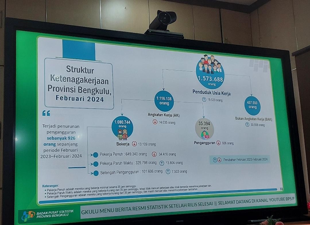 Kepala BPS Provinsi Bengkulu Ir. Win Rizal, ME, menjelaskan, angka pengangguran ini menurun jika dibandingkan dengan Februari 2023. Bahkan angka penurunannya hingga 926 orang.