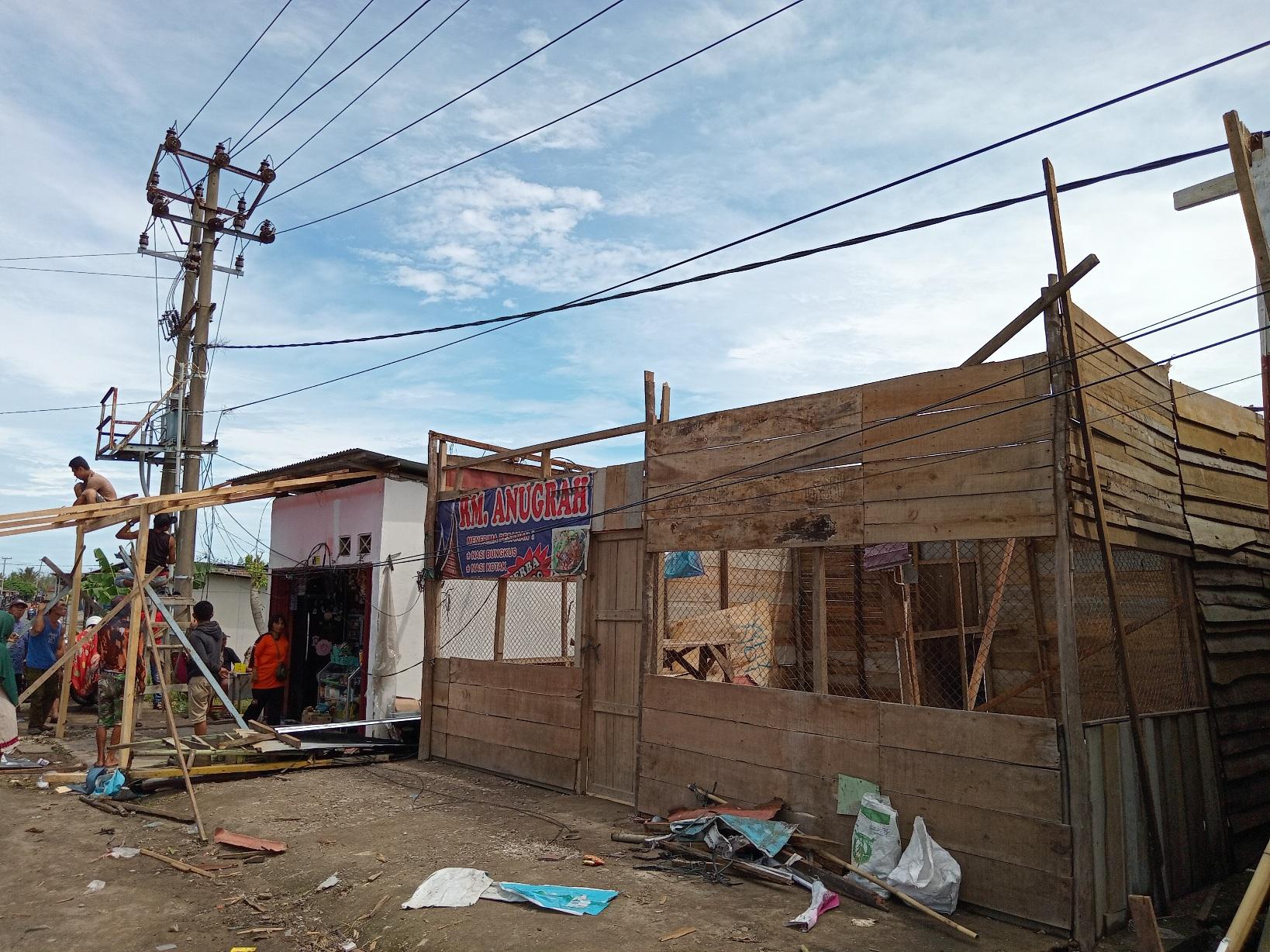 Sebagai langkah darurat, warga tampak bergotong-royong memperbaiki atap ruko dan rumah warga yang rusak. Warga juga membutuhkan bantuan atap seng dan material rumah lainnya.