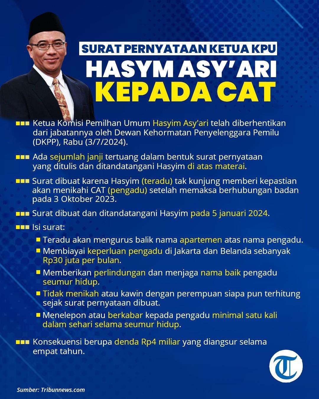 TRIBUNBENGKULU.COM - Inilah isi surat perjanjian Ketua KPU RI Hasyim Asy'ari karena tak kunjung menikahi CA, wanita yang dipaksa Hasyim Asy'ari berhubungan badan di Belanda.