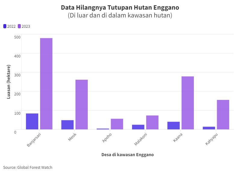 Data Global Forest Watch menunjukan, dalam dua tahun terakhir deforestasi atau pembukaan tutupan hutan di Pulau Enggano terjadi cukup signifikan. Terbesar di Desa Banjarsari, lalu Kaana dan Kahyapu. Tahun 2022 total luas tutupan hutan hilang baik di dalam atau luar kawasan hutan ada seluas 215,26 Hektare. Di tahun 2023 angkanya melonjak menjadi 1302, 44 hektare.