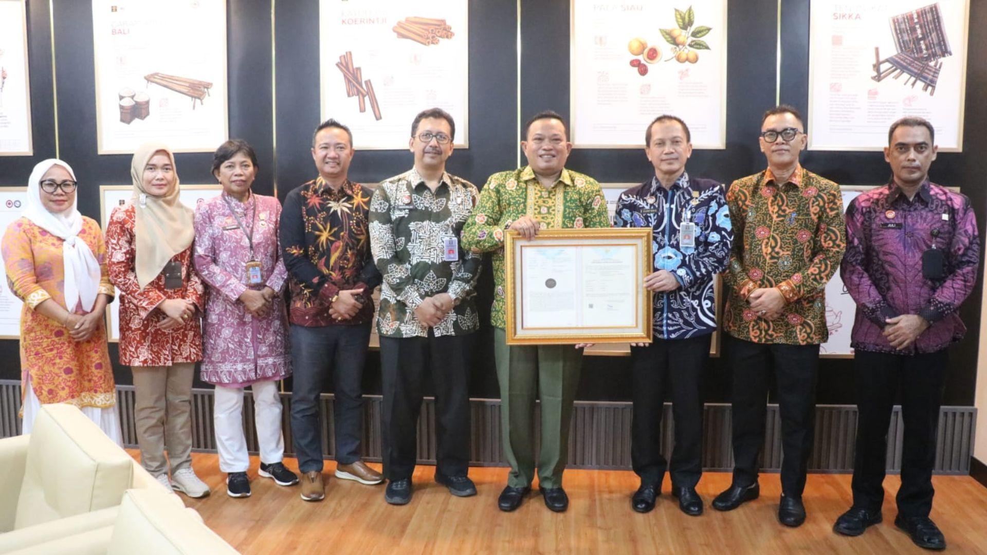 TRIBUNBENGKULU.COM - Direktur Jenderal Kekayaan Intelektual Min Usihen bersama Kepala Kantor Wilayah Kementerian Hukum dan Hak Asasi Manusia Bengkulu Santosa secara resmi menyerahkan sertifikat Indikasi Geografis untuk Tenun Bumpak dari Kabupaten Seluma kepada Bupati Erwin Octavian.