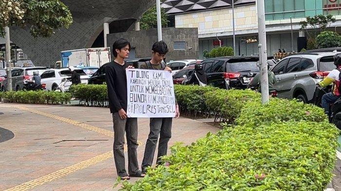 "TOLONG KAMI... KAMI INGIN MENJUAL GINJAL UNTUK MEMBEBASKAN BUNDA KAMI YANG DITAHAN DI POLRES TANGSEL," demikian bunyi tulisan di poster yang mereka bawa.